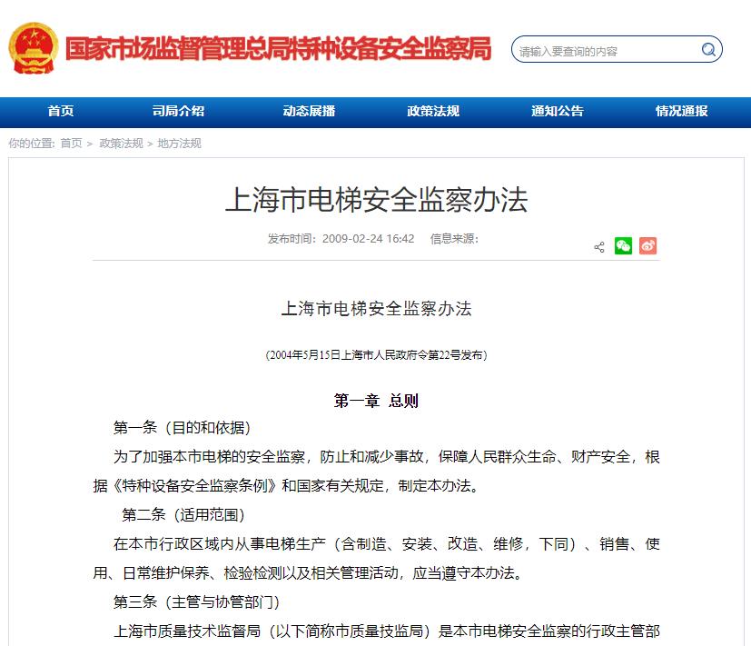 上海市質(zhì)量技術(shù)監(jiān)督局(以下簡稱市質(zhì)量技監(jiān)局)是本市電梯安全監(jiān)察的行政主管部門。區(qū)(縣)質(zhì)量技術(shù)監(jiān)督局(以下簡稱區(qū)(縣)質(zhì)量技監(jiān)局)負責(zé)本行政區(qū)域內(nèi)電梯的安全監(jiān)察工作。