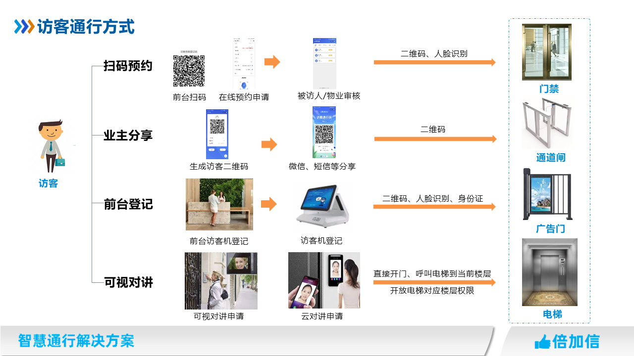 在住宅小區(qū)、寫字樓、園區(qū)、企事業(yè)單位等場所,物業(yè)往往針對外來人員都需要管控,我司提供多種訪客通行解決方案,滿足不同場景訪客進(jìn)出物業(yè)管理需求。