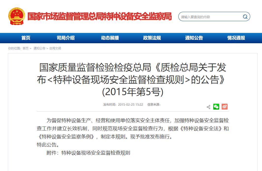 《特種設(shè)備現(xiàn)場安全監(jiān)督檢查規(guī)則》質(zhì)檢總局2015年第5號