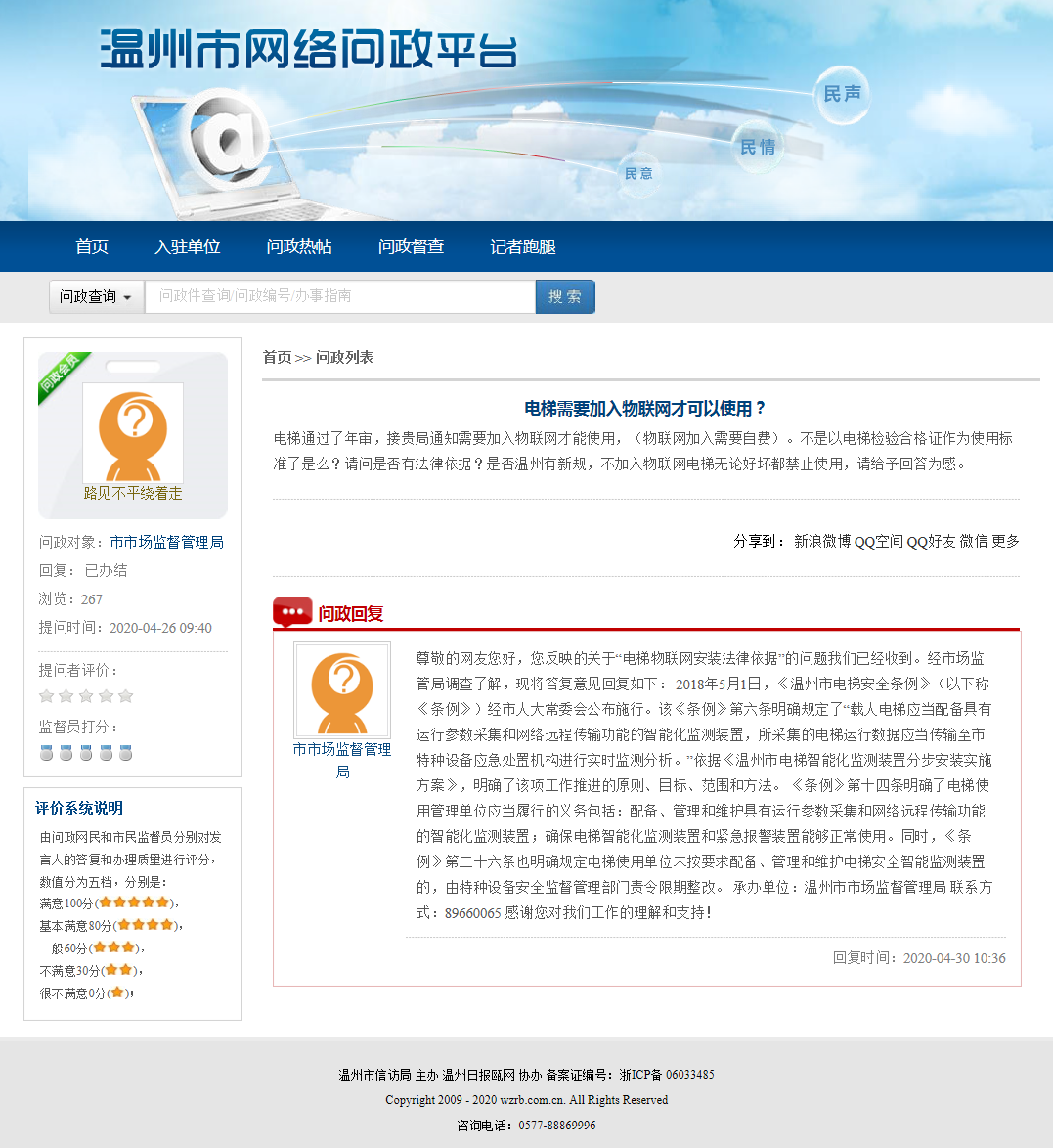 尊敬的網(wǎng)友您好,您反映的關(guān)于“電梯物聯(lián)網(wǎng)安裝法律依據(jù)”的問題我們已經(jīng)收到。經(jīng)市場監(jiān)管局調(diào)查了解,現(xiàn)將答復(fù)意見回復(fù)如下: 2018年5月1日,《溫州市電梯安全條例》(以下稱《條例》)經(jīng)市人大常委會公布施行。該《條例》第六條明確規(guī)定了“載人電梯應(yīng)當(dāng)配備具有運行參數(shù)采集和網(wǎng)絡(luò)遠(yuǎn)程傳輸功能的智能化監(jiān)測裝置,所采集的電梯運行數(shù)據(jù)應(yīng)當(dāng)傳輸至市特種設(shè)備應(yīng)急處置機(jī)構(gòu)進(jìn)行實時監(jiān)測分析!币罁(jù)《溫州市電梯智能化監(jiān)測裝置分步安裝實施方案》,明確了該項工作推進(jìn)的原則、目標(biāo)、范圍和方法。 《條例》第十四條明確了電梯使用管理單位應(yīng)當(dāng)履行的義務(wù)包括:配備、管理和維護(hù)具有運行參數(shù)采集和網(wǎng)絡(luò)遠(yuǎn)程傳輸功能的智能化監(jiān)測裝置;確保電梯智能化監(jiān)測裝置和緊急報警裝置能夠正常使用。同時,《條例》第二十六條也明確規(guī)定電梯使用單位未按要求配備、管理和維護(hù)電梯安全智能監(jiān)測裝置的,由特種設(shè)備安全監(jiān)督管理部門責(zé)令限期整改。 承辦單位:溫州市市場監(jiān)督管理局 聯(lián)系方式:89660065 感謝您對我們工作的理解和支持!