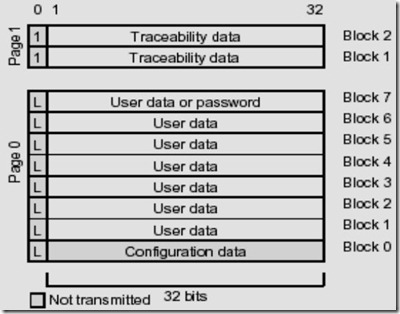 頁0有8個塊,每個塊有33位,第一位為鎖定位,當?shù)谝晃粚懭霝?,該塊后面的32位就無法修改了。頁0塊0為配置字,決定了卡片跟閱讀器通信時工作的頻率,調(diào)制方式及卡片頁0塊號可見數(shù)目等。配置字很關鍵,同樣的T5557卡片,有些閱讀器能讀,有些閱讀器不能讀的,這個閱讀器內(nèi)部單片機的具體程序設計相關,所以一旦設置好不要輕易修改。