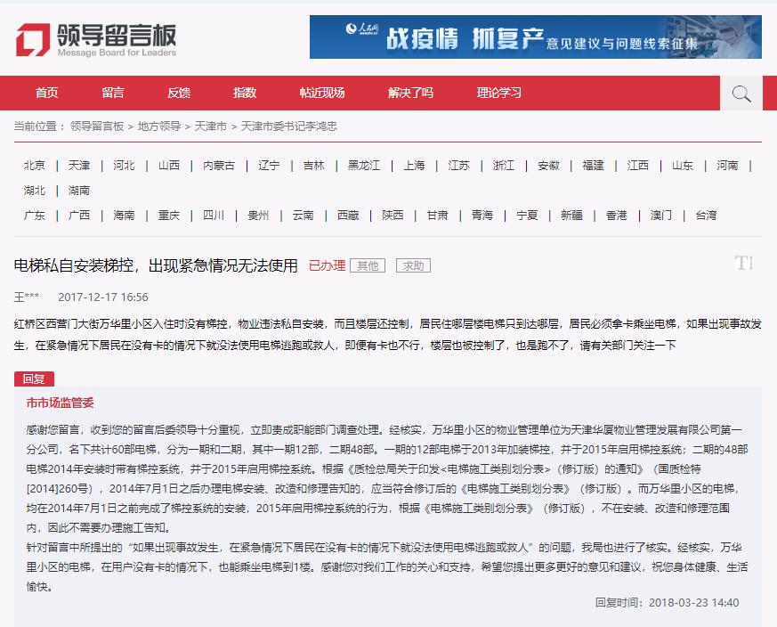 感謝您留言,收到您的留言后委領(lǐng)導(dǎo)十分重視,立即責(zé)成職能部門(mén)調(diào)查處理。經(jīng)核實(shí),萬(wàn)華里小區(qū)的物業(yè)管理單位為天津華廈物業(yè)管理發(fā)展有限公司第一分公司,名下共計(jì)60部電梯,分為一期和二期,其中一期12部,二期48部。一期的12部電梯于2013年加裝梯控,并于2015年啟用梯控系統(tǒng);二期的48部電梯2014年安裝時(shí)帶有梯控系統(tǒng),并于2015年啟用梯控系統(tǒng)。根據(jù)《質(zhì)檢總局關(guān)于印發(fā)<電梯施工類(lèi)別劃分表>(修訂版)的通知》(國(guó)質(zhì)檢特[2014]260號(hào)),2014年7月1日之后辦理電梯安裝、改造和修理告知的,應(yīng)當(dāng)符合修訂后的《電梯施工類(lèi)別劃分表》(修訂版)。而萬(wàn)華里小區(qū)的電梯,均在2014年7月1日之前完成了梯控系統(tǒng)的安裝,2015年啟用梯控系統(tǒng)的行為,根據(jù)《電梯施工類(lèi)別劃分表》(修訂版),不在安裝、改造和修理范圍內(nèi),因此不需要辦理施工告知。