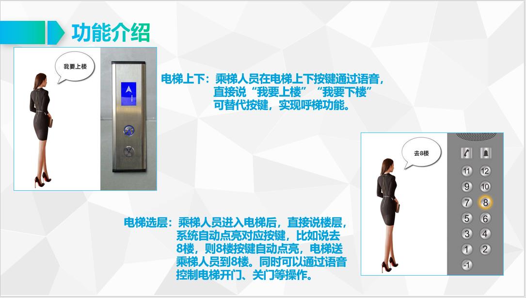 倍加信語音梯控喚醒詞是“智能電梯”或者“小梯小梯”,之所以加換新詞,是為了防止乘梯人誤識別,導致點亮樓層按鍵,多人乘梯,第一個人說換新詞即可,比如說“智能電梯,去8樓”,后面人可以不需要說換新詞,直接說“去9樓”“去12樓”等。如果語音梯控喚醒后,10秒內無人再繼續(xù)說,則語音梯控進入休眠狀態(tài),需要再次語音乘梯則需要喚醒。
