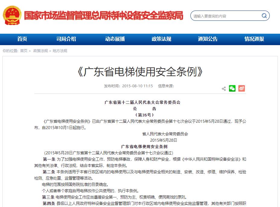 《廣東省電梯使用安全條例》廣東省第十二屆人民代表大會(huì)常務(wù)委員會(huì)(2015年第35號(hào))